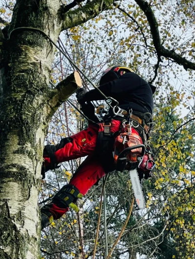 Wir arbeiten mit modernster Seilklettertechnik, was nicht nur am schonendsten für Ihren Baum ist, sondern auch den Einsatz von schwerem Gerät wie Kran oder Hebebühne meist überflüssig macht. Wir kommen auch dorthin, wo Kran und Hebebühne nicht hinkommen!“