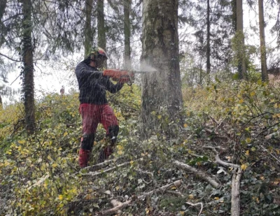 Die Beschaffenheit des zu fällenden Baumes wird natürlich zuerst geklärt und gesichert. Sind Stromleitungen im Weg, Grundstücke oder Straßen?